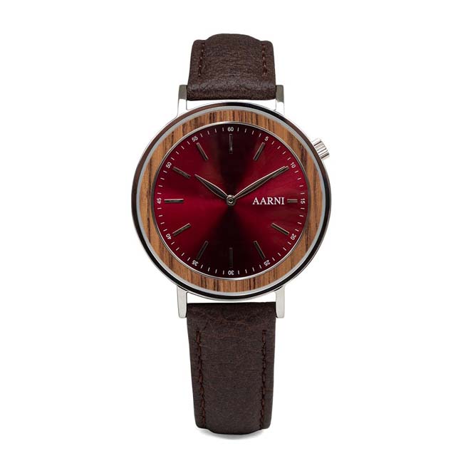 Tyylikäs naisten puukello upealla burgundinpunaisella kiiltävällä kellotaululla, jota kehystää tiikkinen kehys. Laadukas ja pehmeä kotimaisesta hirvennahasta valmistettu ranneke viimeistelee kokonaisuuden. Rannekellossa on paristokäyttöinen kvartsikoneisto ja se on roiskevesisuojattu.