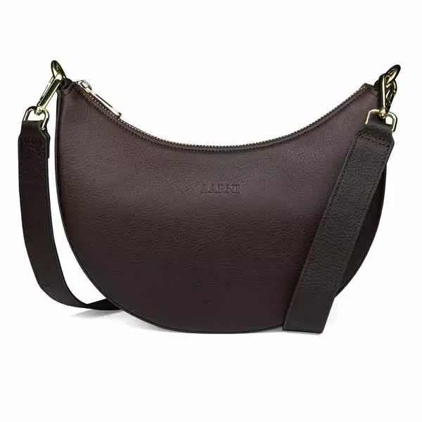 Kaunis puolikuun muotoinen Aarni Luna olkalaukku hurmaa tyylillään ja käytännöllisyydellään. Kaareva, puolikuun muotoinen design mukautuu kauniisti vartaloasi vasten. Aarnin Luna laukku on valmistettu laadukkaasta pohjoismaisesta Full Grain -naudannahasta. Laukku on tummanruskean värinen kullan sävyisillä metalliosilla. Olkalaukun korttitaskut on RFID-suojattu eli etälukusuojattu, mikä estää korttiesi luvattoman skannaamisen. Laukun leveys on 25 cm, korkeus 18,5 cm ja syvyys 6,5 cm. Olkalaukussa on kätevä kullan sävyinen vetoketjusuljenta. Olkalaukun sisältä löytyvät kolme korttitaskua, avoin tasku sekä yksi vetoketjutasku. Laukussa on säädettävä nahkainen olkahihna, joka mahdollistaa laukun kantamisen usealla eri tyylillä. Olkalaukun hihnan pituus on säädettävissä kahdella eri jatkopalalla 97-117 cm sekä 50-65 cm välillä. Hihna on leveydeltään 2,8 cm. Aarni olkalaukku toimitetaan suojaavassa säilytyspussissa, joka on pakattu tyylikkääseen lahjakoteloon.