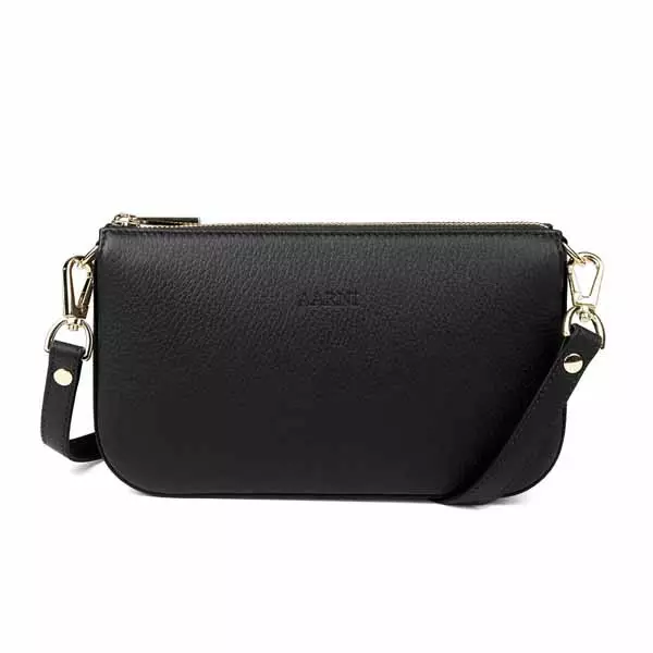 Aarni Sola käsilaukku hurmaa kompaktilla koollaan ja monikäyttöisyydellään. Pouch-malliseen laukkuun saat mahtumaan mukaan tärkeät esineet ja pidät ne helposti saatavilla vetoketjun takana. Sola-laukku on valmistettu kotimaisesta laadukkaasta hirvennahasta. Laukku on mustan värinen kullan sävyisillä metalliosilla. Laukun leveys on 22 cm, korkeus 13 cm ja syvyys 4/1,5 cm. Käsilaukussa on kätevä kullan sävyinen vetoketjusuljenta. Käsilaukun sisältä löytyvät neljä korttitaskua, avoin sivutasku sekä yksi vetoketjutasku. Laukussa on hirvennahkainen olkahihna, jonka pituus on 60 cm ja leveys 1,5 cm. Laukkuun on myös ostettavissa erikseen pidempi Aarni olkahihna. Aarni käsilaukku toimitetaan suojaavassa säilytyspussissa, joka on pakattu tyylikkääseen lahjakoteloon.