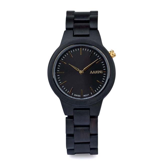 Upean tummanpuhuva naisten puukello, jossa tummaa eebenpuuta täydentävät kultaisen sävyiset yksityiskohdat. Kellossa on laadukas sveitsiläinen Ronda-kvartsikoneisto, ja mustaa kellotaulua suojaa naarmuuntumaton safiiripinnoitettu mineraalilasi.