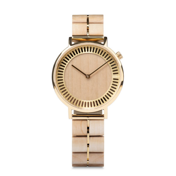 Alvar ja Aino Aalto, Suomidesignin kiistaton voimapari. Aarni herätti henkiin ikonisen muoitoilun modernina kellomallistona. Mallisto on suunniteltu yhdessä muotoilija Harri Koskisen kanssa. Tässä kellomallistossa yhdistyy Aaltojen klassiset muotoilun elementit heidän lempimateriaaliinsa, kotimaiseen koivuun. Tässä naisten A36-kellossa on kaunis, vaalea taulu yhdistetty kullan sävyiseen runkoon ja minuuttikehään. Kellotaulua suojaa laadukas safiiripinnoitettu mineraalilasi. Kellon ranneke on kotimaista koivua ja siinä on vahvikkeena kullan sävyiset yksityiskohdat. Kellossa on sveitsiläinen Ronda 1062-kvartsikoneisto ja se on roiskeveitiivis 5 bar. Kelloon on mahollista ostaa kotimaisesta hirvennahasta valmistettu vaihtoranneke.