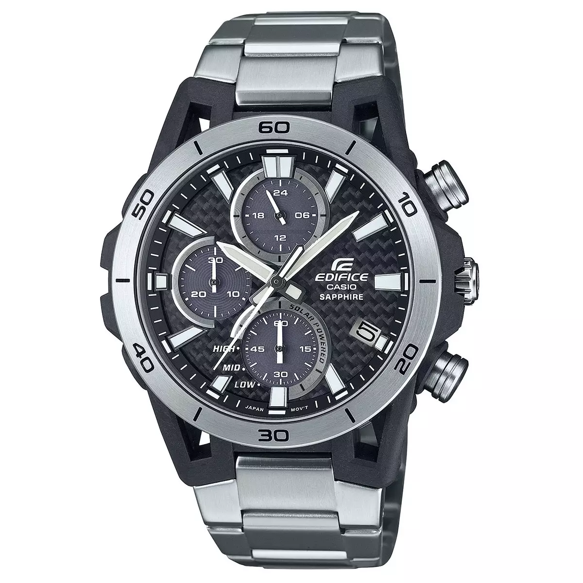 Auringonvalosta sekä keinovalosta virtansa ottava Casion analoginen Casio Edifice-rannekello sporttisella harmaalla kellotaululla. Kellosta löytyvät ajanottotoiminto, vuorokaudenaikanäyttö sekä päivyri kello neljän kohdalta. Kellossa on hyvin käyttöä ja kulumista kestävä ruostumattomasta teräksestä ja hiilikuidusta valmistettu runko ja teräsranneke. Kellotaulua suojaa laadukas naarmuuntumaton safiirilasi heijastamattomalla pinnoitteella. Kellon rungon leveys on 44,5 mm ja paksuus 13,3 mm. Kello on vesitiivis 10 bar, eli se kestää jopa pintauintia. Kellon paino on 118 grammaa. Kellossa on solar-koneisto, joten paristonvaihtoja ei tarvita. Täydellä varauksella jopa viiden kuukauden akunkesto!