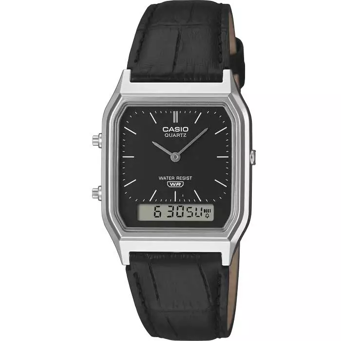 Casio Vintage AQ-230EL-1AEF tuo suosittuun ja kulmikkaaseen AQ-230-sarjaan ripauksen hienostunutta eleganssia. Tässä mallissa ikoninen hopeanvärinen runko on yhdistetty laadukkaaseen mustaan nahkarannekkeeseen, jossa on klassinen, hieman kuvioitu pinta. Tämä yhdistelmä tekee kellosta ajattoman asusteen, joka sopii täydellisesti niin arkeen kuin juhlavampaankin pukeutumiseen.