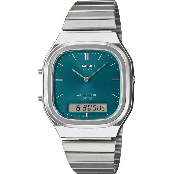 Casio Vintage AQ-240E-3AEF yhdistää retrotyylin moderniin hienostuneisuuteen. Tämä malli on päivitetty versio suositusta AQ-230-sarjasta, ja siinä on hieman pyöristetympi runko sekä pehmeät metalliset kaaret, jotka tekevät kellosta elegantin ja miellyttävän ranteessa. Kellon katseenvangitsijana toimii upea vihreä kellotaulu, jonka aurinkohionta (sun-ray finish) saa pinnan elämään kauniisti valon osuessa siihen.