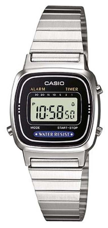 Klassinen Casio Vintage rannekello, jossa on digitaalinäyttö ja retromainen ilme. Kellon runko on valmistettu muovista ja kellon ranneke on ruostumatonta terästä. Kellon rungon leveys on 25 mm. Kellotaulua suojaa kestävä akryylilasi. Kellossa on ajanottotoiminto 1/10 sekunnin tarkkuudella. Lisäksi kellossa on esimerkiksi hälytystoiminto ja ajastin ennalta määrtetyillä arvoilla 30 minuuttin asti. Kello on vesitiivis 30 metriin saakka.