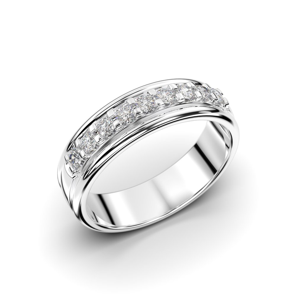 Upea Festive Sophia Triple sormus jossa on vahva runko ja jonka molemmilla reunoilla ohuet, hieman kohollaan olevat renkaat korostavat kaunista timanttirivistöä.