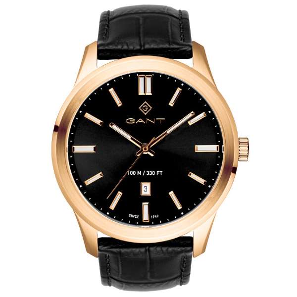 Erinomaisesti pukukelloksi soveltuva Gantin miesten rannekello mustalla kellotaululla ja kullan värisellä rungolla. Kellossa on ruostumattomasta teräksestä valmistettu runko ja musta krokotiilikuvioinen nahkaranneke. Minimalistisen mustan kellotaulun halkaisija on 43 mm, ja siitä löytyvät kullan sävyiset viivaindeksit. Kellotaulusta löytyy myös käytännöllinen päivyri. Kellon koneisto kestää pintauintia, ja sen vesitiiviysluokka on 10 bar. Rannekello saa virtansa paristolla toimivasta kvartsikoneistosta.