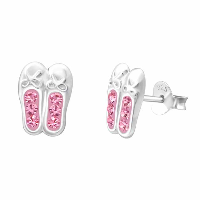 Lasten hopeiset balettitossu-korvakorut pinkeillä zirkoneilla. Kauniita balettitossuja koristavat vaaleanpunaiset korukivet. Korvakoruissa on luotettava tappikiinnitys. Korvakorujen koko on 7 x 9 mm. Sirot ja kevyet nappikorvakorut, joita lapsi voi käyttää arjessa! Korvakorujen valmistusmateriaali on laadukas nikkelitön 925 sterling hopea.