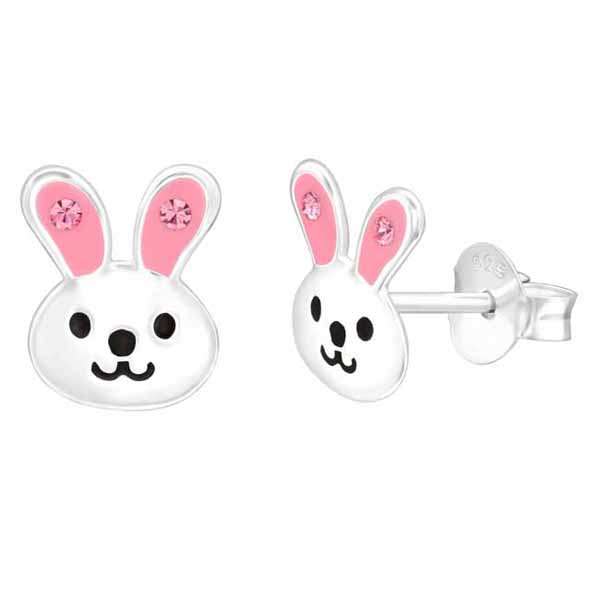 Lasten hopeiset pupu-korvakorut. Suloiset jänis-korvakorut, joissa esiintyy hopeinen kani vaaleanpunaisilla korvilla. Korvia koristaa lisäksi pinkit zirkoni-korukivet. Korvakoruissa on luotettava tappikiinnitys. Korvakorujen koko on 7 x 8 mm. Sirot ja kevyet nappikorvakorut, joita lapsi voi käyttää arjessa! Korvakorujen valmistusmateriaali on laadukas nikkelitön 925 sterling hopea.