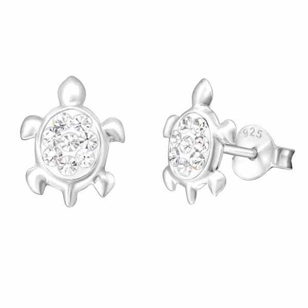 Lasten hopeiset kilpikonna-korvakorut. Säihkyvät lasten hopeiset korvakorut kirkkain zirkonein koristelluilla kilpikonnilla. Korvakoruissa on luotettava tappikiinnitys. Korvakorujen koko on 9 x 11 mm. Sirot ja kevyet nappikorvakorut, joita lapsi voi käyttää arjessa! Korvakorujen valmistusmateriaali on laadukas nikkelitön 925 sterling hopea.