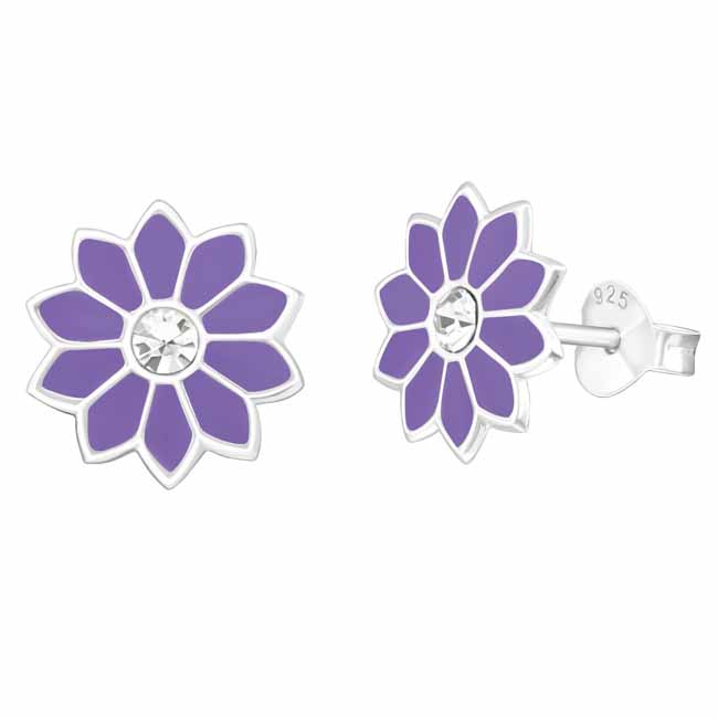 Lasten hopeiset kukkakorvakorut. Lasten hopeiset korvakorut violetilla kukalla. Kukan keskellä säihkyy kirkas zirkoni. Korvakoruissa on luotettava tappikiinnitys. Korvakorujen koko on 11 x 11 mm. Sirot ja kevyet nappikorvakorut, joita lapsi voi käyttää arjessa! Korvakorujen valmistusmateriaali on laadukas nikkelitön 925 sterling hopea.