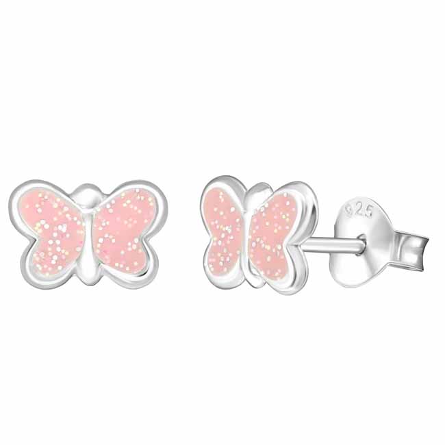Lasten hopeiset perhoskorvakorut. Hempeät lasten hopeiset korvakorut perhoskuvioilla. Perhosen glitter-siivet ovat vaaleanpunaiset. Korvakoruissa on luotettava tappikiinnitys. Korvakorujen koko on 8 x 5 mm. Sirot ja kevyet nappikorvakorut, joita lapsi voi käyttää arjessa! Korvakorujen valmistusmateriaali on laadukas nikkelitön 925 sterling hopea.