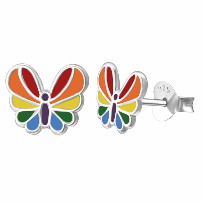Lasten hopeiset perhoskorvakorut sateenkaaren väreissä. Kauniit lasten hopeiset korvakorut sateenkaaren värein koristelluilla perhosilla. Korvakoruissa on luotettava tappikiinnitys. Korvakorujen koko on 9 x 8 mm. Sirot ja kevyet nappikorvakorut, joita lapsi voi käyttää arjessa! Korvakorujen valmistusmateriaali on laadukas nikkelitön 925 sterling hopea.