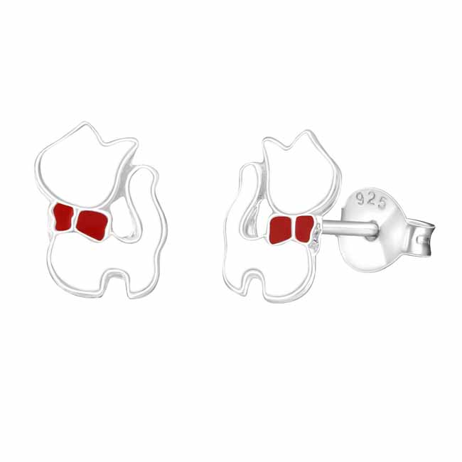 Lasten hopeiset kissa-korvakorut. Suloiset kissakorvakorut, joissa esiintyy valkoinen kissa kaulassaan punainen rusetti. Korvakoruissa on luotettava tappikiinnitys. Korvakorujen koko on 7 x 10 mm. Sirot ja kevyet nappikorvakorut, joita lapsi voi käyttää arjessa! Korvakorujen valmistusmateriaali on laadukas nikkelitön 925 sterling hopea.