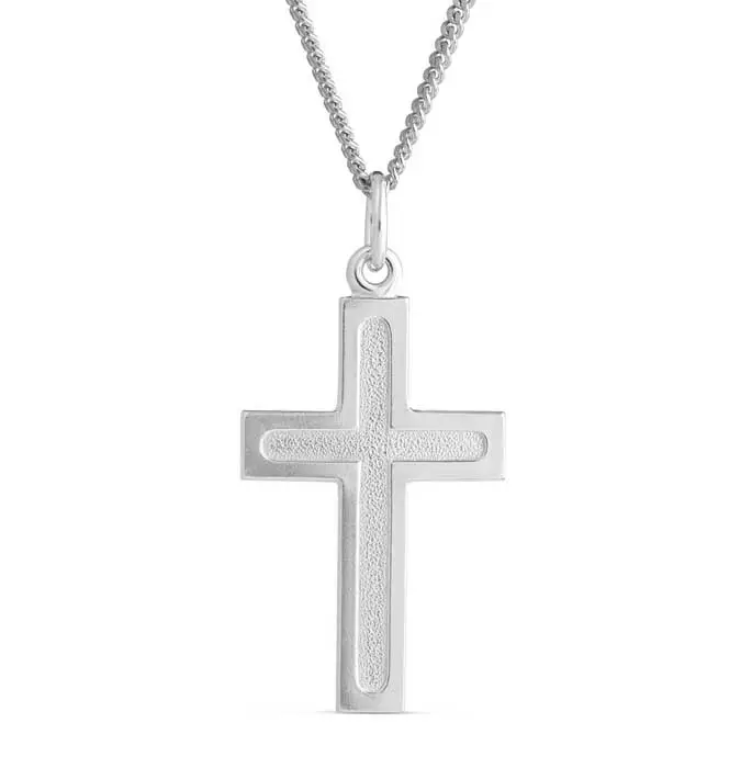 Hopeinen ristiriipus pelkistetyllä kuvioinnilla. Kookkaan hopearistin korkeus on 32 mm ja leveys on 18 mm. Hopearistin ketju on kätevästi säädettävissä pituuksiin 45 cm ja 50 cm. Materiaali on laadukas 925 sterling-hopea, joka on platinoitu.