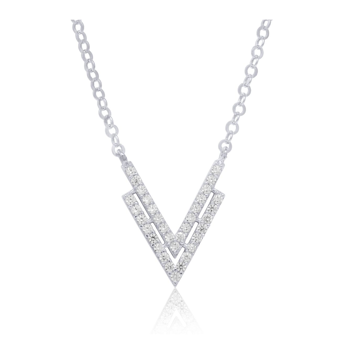 Moderni ja raikas hopeinen kaulakoru zirkonia-korukivillä kahden kolmion muodossa. Riipus on kiinteästi kiinni säädettävässä 43-46 pituisessa ketjussa.