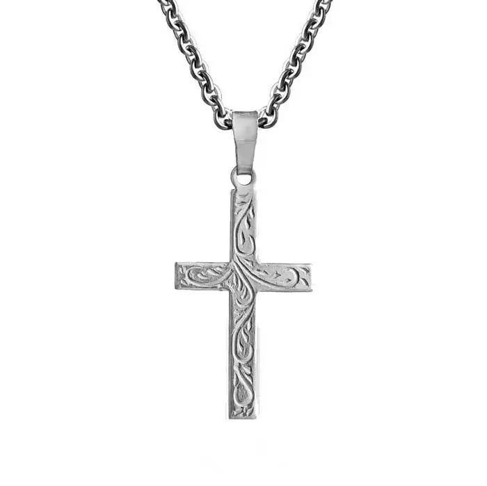 Koristeellinen hopeinen ristiriipus köynnöskuvioilla. Hopearistin korkeus on 22 mm ja leveys on 13 mm. Hopearistin ketju on kätevästi säädettävissä pituuksiin 45 cm ja 50 cm. Materiaali on laadukas 925 sterling-hopea, joka on platinoitu.