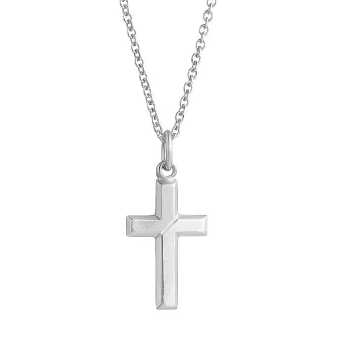 Hopeinen ristiriipus pelkistetyllä kuvioinnilla. Hopearistin korkeus on 23 mm ja leveys on 13 mm. Hopearistin ketju on kätevästi säädettävissä pituuksiin 45 cm ja 50 cm. Materiaali on laadukas 925 sterling-hopea, joka on platinoitu.
