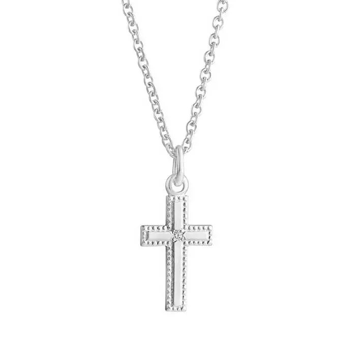 Hopeinen ristiriipus koristeellisella reunakuvioinnilla ja aidolla timantilla. Hopearistin korkeus on 19 mm ja leveys on 10 mm. Timantin paino on 0,01 ct ja laatu W/Si. Hopearistin ketju on kätevästi säädettävissä pituuksiin 45 cm ja 50 cm. Materiaali on laadukas 925 sterling-hopea, joka on platinoitu.