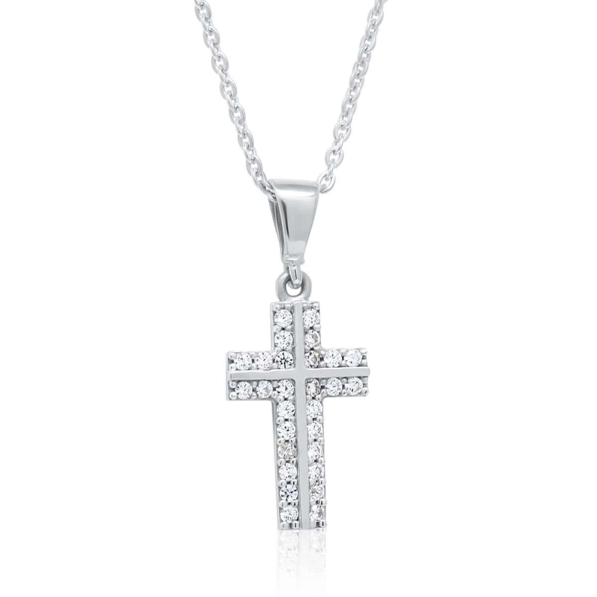 Siro hopearisti, jota koristavat kirkkaat zirkonia-korukivet. Tämän kauniin ristin leveys on 9 mm ja korkeus 16 mm. Hopeaketjun pituus on kätevästi säädettävissä välillä 40-45 cm.