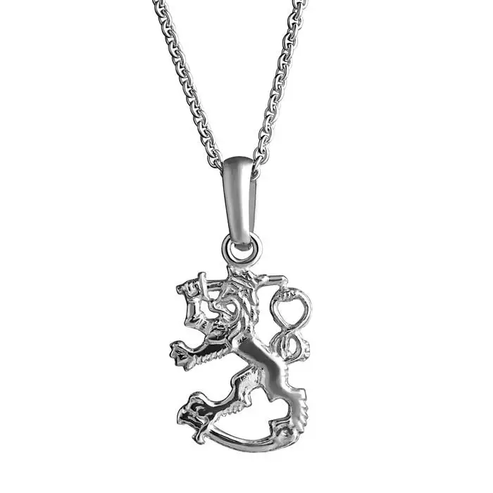 Hopeinen Suomi Leijona kaulakoru. Suomileijonan leveys on 16 mm ja korkeus on 21 mm. Hopeaketju on kätevästi säädettävissä pituuksiin 45 cm ja 50 cm. Materiaali 925 sterling-hopea.