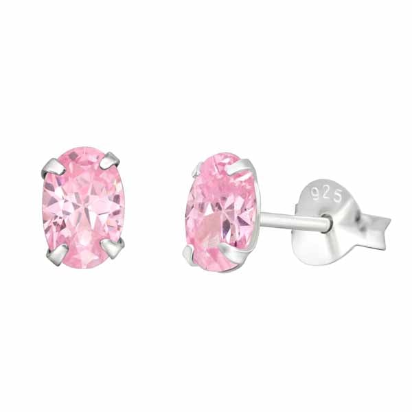 Yksikiviset hopeiset tappikorvakorut vaaleanpunaisilla zirkonia-korukivillä. Nappikorvakorujen leveys on 4 mm ja korkeus 6 mm ja niissä on luotettava tappikiinnitys.