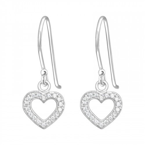 Sirot roikkuvat hopeakorvakorut kirkkain zirkonia-korukivin koristelluilla sydämillä. Koruosan leveys on 7 mm ja korkeus 9 mm. Korvakoruissa on koukkukiinnitys.