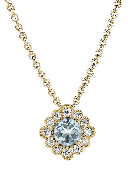 Keltakultainen timanttiriipus kauniilla akvamariini-kivellä. Tämä kaunis naisten timanttikaulakoru on saanut inspiraationsa kaunokainen-nimisestä kasvista. Riipus on valmistettu lähes 100% kierrätetystä 14 karaatin keltakullasta. Kierrätetty kulta ei ole ainoastaan kaunis vaan myös on ekologinen ja ympäristöystävällinen korumateriaali. Riipuksen koruosan keskellä säkenöi 5 mm leveä hennon sininen akvamariini, jota puolestaan ympäröi säkenöivät timantit, timanttien yhteispaino on 0,16 ct. Riipuksessa on mukana säädettävä 42/45 cm ketju.