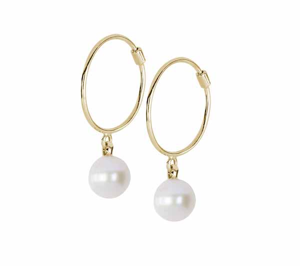 Kohinoor keltakultaiset Deco-korvakorut. Kauniit kultaiset korvarenkaat, joista roikkuu valkoinen makeanveden helmi. Korvarenkaan halkaisija on 14 mm. Valmistettu 14k keltakullasta.