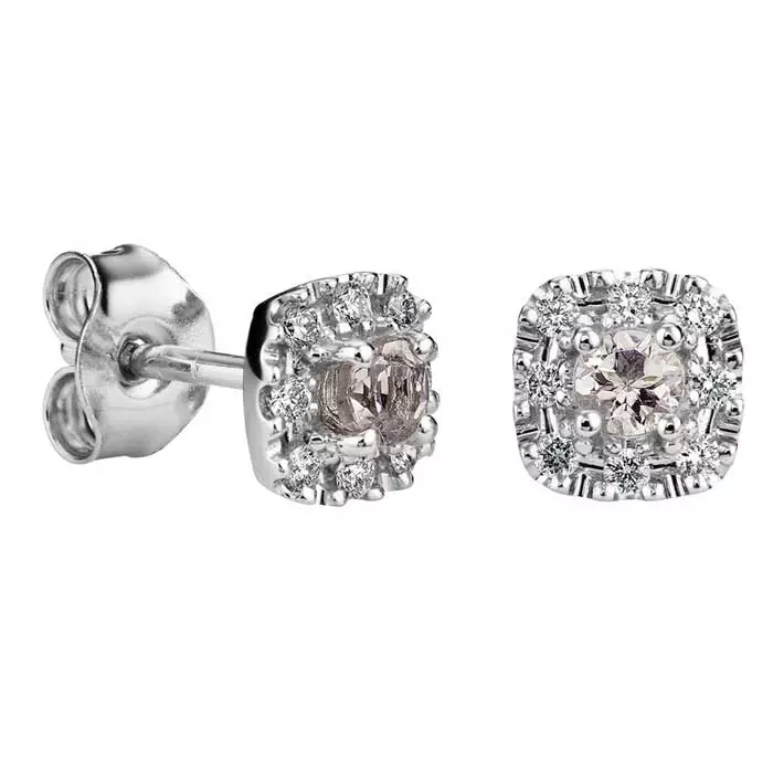 Valkokultaiset timanttikorvakorut morganiitilla. Nämä kauniit korvakorut on valmistettu lähes 100% kierrätetystä 14 karaatin valkokullasta. Kierrätetty kulta ei ole ainoastaan kaunis, vaan myös ekologinen ja ympäristöystävällinen korumateriaali. Korvakoruissa on käytännöllinen ja helppo tappikiinnitys. Yhdessä korvakorussa on yhteensä kahdeksan säkenöivää 0,01 ct kokoista timanttia ja ne ympäröivät 3 mm leveää morganiittikiveä. Yhteensä korvakoruissa on timantteja 16 kappaletta ja niiden yhteispaino on 0,16 ct.