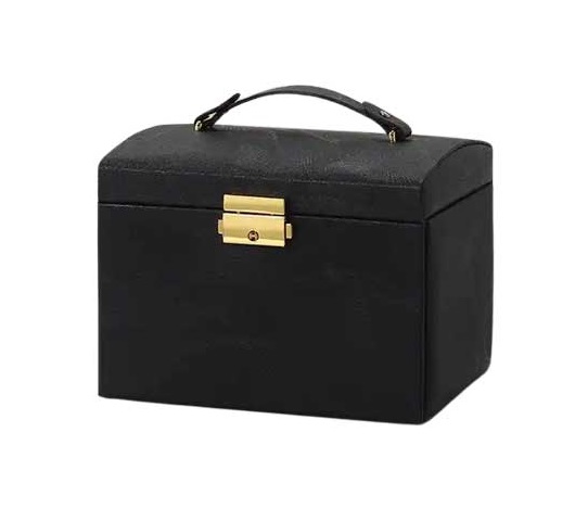 Kaunis ja tilava musta keinonahkainen korurasia. Rasian sisus on pehmeää vaaleaa kangasta, jonka hellässä huomassa rakkaat korusi ovat suojassa naarmuilta. Rasian musta pinta on kestävää ja likaa hylkivää keinonahkaa, joka on kuvioitu hienostuneesti. Korurasian kannen sisäpuolella on peili, jonka avulla voit mallailla koruja päällesi. Korulippaasta löydät omat paikat niin kaulakoruille, rannekoruille, sormuksille kuin korvakoruillekin. Korulaukun saa lukittua sen mukana toimitettavalla avaimella, jolloin voit kantaa korulaukkua huoletta tai suojata korusi uteliailta katseilta. Korulaukun leveys on 18 cm, syvyys 14 cm ja korkeus 15 cm.