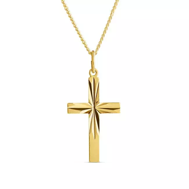 Timanttileikattu kullattu hopeinen ristiriipus. Kullatun ristin keskeltä löytyy valoa heijastava timanttileikkaus-kuviointi. Hopearistin korkeus on 18 mm ja leveys on 10 mm. Hopearistin ketju on kätevästi säädettävissä pituuksiin 45 cm ja 50 cm. Materiaali on laadukas 925 sterling-hopea, joka on keltakullattu.