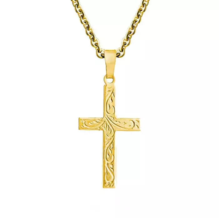 Koristeellinen kullattu ristiriipus köynnöskuvioilla. Hopearistin korkeus on 22 mm ja leveys on 13 mm. Hopearistin ketju on kätevästi säädettävissä pituuksiin 45 cm ja 50 cm.