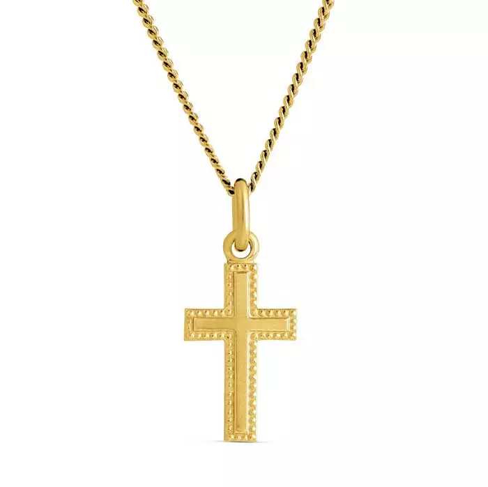 Kullattu hopeinen ristiriipus koristeellisella reunakuvioinnilla. Hopearistin korkeus on 19 mm ja leveys on 10 mm. Hopearistin ketju on kätevästi säädettävissä pituuksiin 45 cm ja 50 cm. Materiaali on laadukas 925 sterling-hopea, joka on keltakullattu.