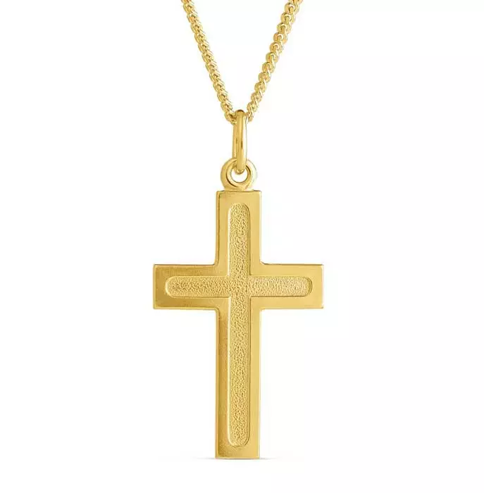Kullattu hopeinen ristiriipus pelkistetyllä kuvioinnilla. Kookkaan hopearistin korkeus on 32 mm ja leveys on 18 mm. Hopearistin ketju on kätevästi säädettävissä pituuksiin 45 cm ja 50 cm. Materiaali on laadukas 925 sterling-hopea, joka on keltakullattu.