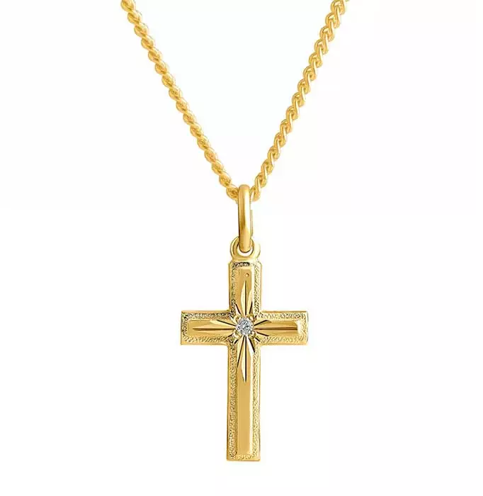 Säkenöivä kullattu ristiriipus aidolla timantilla ja kauniisti valoa heijastavalla timanttileikkaus-kuvioinnilla. Hopearistin korkeus on 18 mm ja leveys on 11 mm. Timantin paino on 0,01 ct ja laatu W/Si. Hopearistin ketju on kätevästi säädettävissä pituuksiin 45 cm ja 50 cm. Materiaali on laadukas 925 sterling-hopea, joka on kullattu.