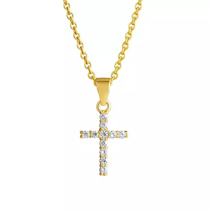 Kullattu hopeinen ristiriipus kirkkaana säkenöivillä zirkonia-korukivillä. Hopearistin korkeus on 15 mm ja leveys on 10 mm. Hopearistin ketju on kätevästi säädettävissä pituuksiin 45 cm ja 50 cm. Materiaali on laadukas 925 sterling-hopea, joka on keltakullattu.