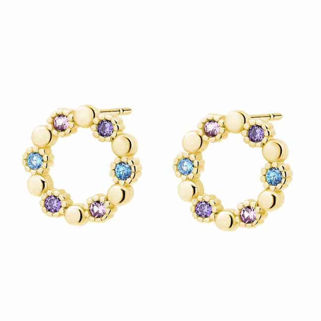 Kullatut ympyrän muotoiset hopeakorvakorut. Nämä kauniit kehäkorvakorut sopivat niin lapselle kuin aikuisellekin! Korvakorut on koristeltu sinisin, vaaleanpunaisin ja violetein zirkoni-korukivin. Korvakoruissa on luotettava tappikiinnitys. Korvakorujen koko on 9,7 mm. Sirot ja kevyet nappikorvakorut, joita voi käyttää arjessa! Korvakorujen valmistusmateriaali on laadukas nikkelitön 925 sterling hopea.