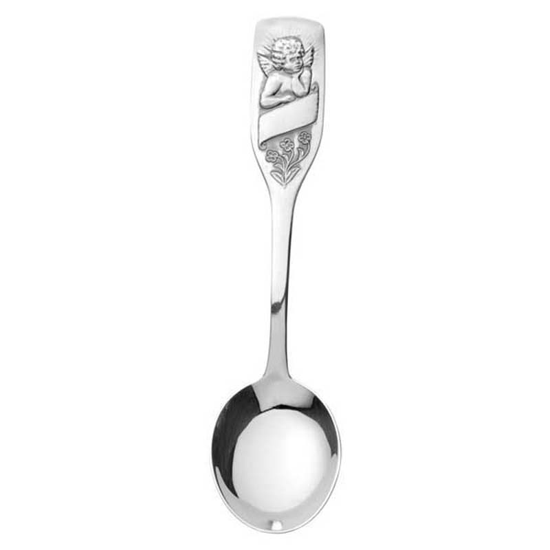 Hopeinen kummilusikka enkelikuviolla. Kultakeskuksen Enkeli-kummilusikassa on maalauksellinen enkeli ja erikseen kohta kaiverrukselle lusikan etupuolella, johon voi kaiverruttaa vaikkapa lapsen nimen. Muut syntymätiedot mahtuu kaivertamaan lusikan takapuolelle. Kaunis kastelusikka on ihana nimiäislahja!