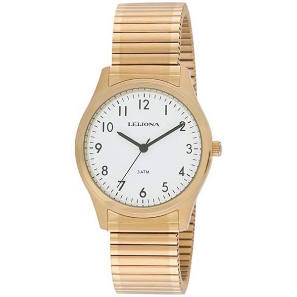 Miesten Leijona rannekello joustorannekkeella. Kellossa on 34 mm valkoinen kellotaulu ja runko on kultadubleeta. Leijona kelloille myönnetään kahden vuoden takuu.