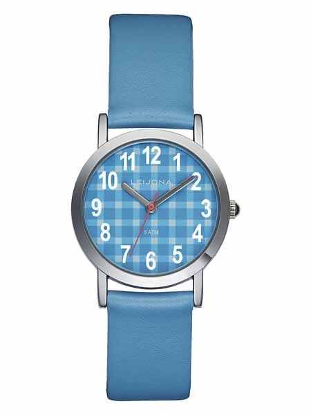 Leijona lasten rannekello 5323-911. Kellon rungon materiaali on laadukas ja kestävä ruostumaton teräs hopean sävyssä. Kellossa on turkoosi synteettinen nahkaranneke. Sinisessä ruutukuvioisessa 29,5 mm leveässä kellotaulussa on selkeät numeroindeksit, joista lapsen on helppo katsoa kellonaikaa. Rannekellon vesitiiviysluokitus on 5 atm / 50M eli kellon koneisto on suojattu roiskevedeltä. Kellossa on paristokäyttöinen kvartsikoneisto.