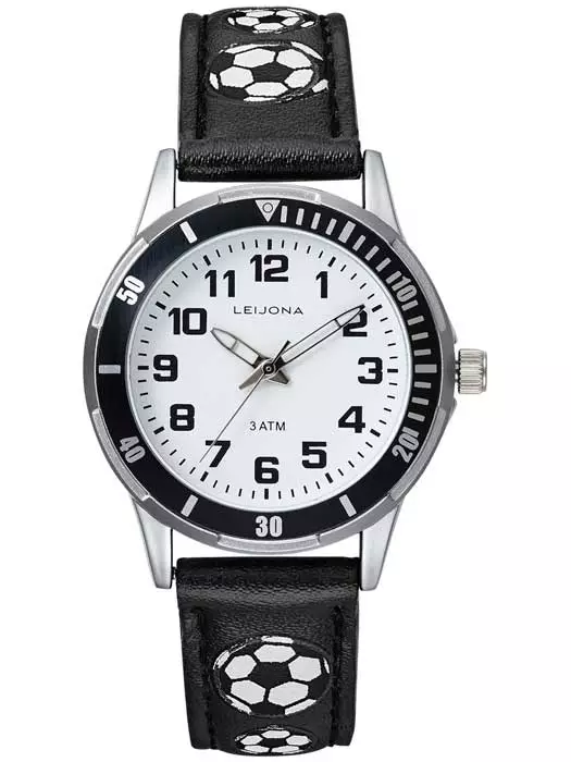 Lasten rannekellossa on miellyttävä jalkapalloteemainen ranneke. Teräsrunko ja valkoinen 32 mm kellotaulu. Selkeät ja suuret numerot. Kello on roiskevesitiivis, mutta ei kestä uintia tai suihkussa käyntiä.