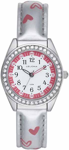 Leijona lasten kello 5323-967. Kellon rungon materiaali on laadukas ja kestävä ruostumaton teräs hopean sävyssä. Kellossa on suloinen hopeanvärinen vaaleanpunaisin sydämin koristeltu synteettinen nahkaranneke. Siron 28,5 mm leveän kellotaulun reunoja koristavat säihkyvät korukivet. Kellossa on valkoinen kellotaulu selkeillä numeroindekseillä, joista lapsen on helppo katsoa kellonaikaa. Rannekellon vesitiiviysluokitus on 5 atm / 50M eli kello on rajoitetusti vesitiivis ja kestää roiskeveden. Kellossa on paristokäyttöinen kvartsikoneisto.
