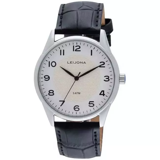 Leijona miesten rannekello valkoisella kellotaululla ja mustalla nahkarannekkeella. Kellossa on 3 bar roiskevesisuojattu paristokäyttöinen kvartsikoneisto. Rungon leveys 42 mm.
