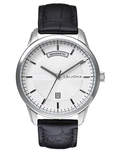 Klassinen ja elegantti Leijona Töölö rannekello mustalla nahkarannekkeella ja valkoisella kellotaululla. Kellossa hopeanvärinen teräsrunko sekä hopeanväriset indeksit ja osoittimet. Kellossa on kaksoispäivyri, päivämääränäyttö on kello kuuden kohdalla ja viikonpäivänäyttö puolestaan kello kahdentoista kohdalla. Kellotaulua suojaa käyttökelloissa hyvin yleinen mineraalilasi. Tämä kello on vesitiivis 50 M asti ja kello saa käyntivoimansa paristokäyttöisestä kvartsikoneistosta.
