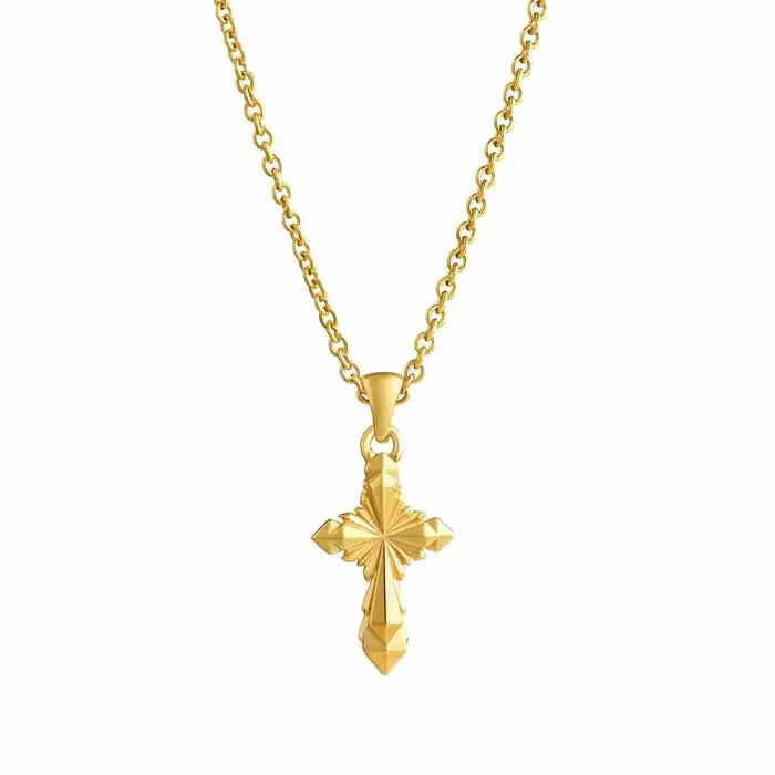 Veistoksellisesti muotoiltu hopeinen ristiriipus. Hopearistin korkeus on 23 mm ja leveys on 11 mm. Hopearistin ketju on kätevästi säädettävissä pituuksiin 45 cm ja 50 cm. Materiaali on laadukas kullattu 925 sterling-hopea.