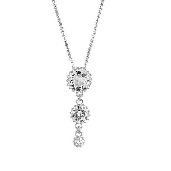 Naisten hopeinen kaulakoru kauniisti säihkyvillä kirkkailla zirkonia-korukivillä. Kolme eri kokoista kirkasta korukiveä ihastuttavat koristeellisissa istutuksissa. Kullatun hopeariipuksen koko on 12 x 39 mm. Riipuksen hopeaketjun pituus on kätevästi säädettävissä pituuksiin 45 cm ja 50 cm. Kaulakoru on valmistettu laadukkaasta 925 sterling-hopeasta.