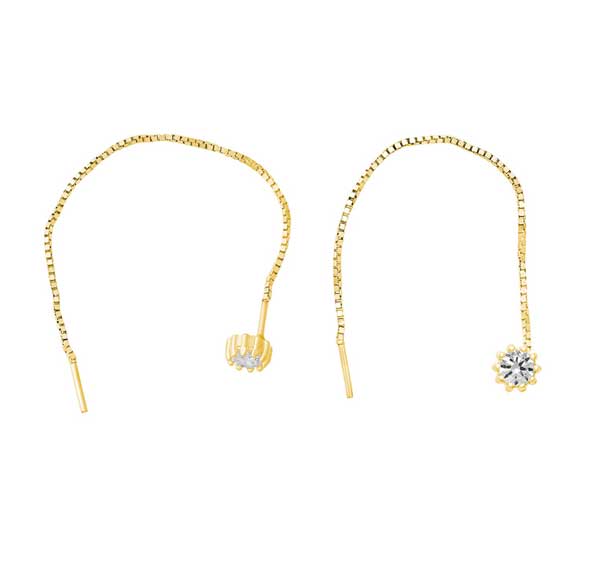 Naisten kullatut hopeiset ketjukorvakorut kauniisti säihkyvillä zirkonia-korukivillä. Siroa korvakorua koristaa kirkas pyöreä zirkonia koristeellisessa istutuksessa. Kullatun hopeakorvakorun koko on 4 mm, ja ketjun pituus on 70 mm. Korvakorut on valmistettu laadukkaasta 925 sterling-hopeasta. Korvakoruissa on ketjukiinnitys, eli ketju pujotetaan korvareiän läpi, ja ketju roikkuu kauniisti korvalehden takana.