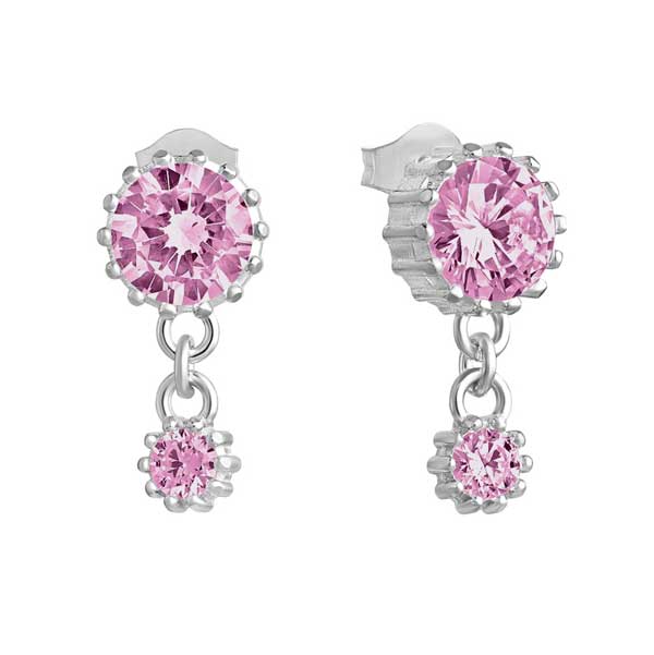 Naisten roikkuvat hopeiset korvakorut kauniisti säihkyvillä vaaleanpunaisilla zirkonia-korukivillä. Korvakoruja koristavat isompi ja pienempi pyöreä zirkonia koristeellisissa istutuksissa. Zirkonien koot ovat 8 mm ja 4 mm. Korvakorun koko on 9 x 20 mm. Korvakorut on valmistettu laadukkaasta 925 sterling-hopeasta. Korvakoruissa on tukeva ja luotettava tappikiinnitys.