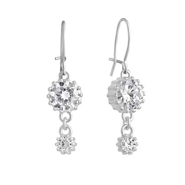 Naisten roikkuvat hopeiset korvakorut kauniisti säihkyvillä zirkonia-korukivillä. Korvakoruja koristavat isompi ja pienempi pyöreä zirkonia koristeellisissa istutuksissa. Roikkuvan hopeakorvakorun koko on 9 x 20 mm. Korvakorut on valmistettu laadukkaasta 925 sterling-hopeasta. Korvakoruissa on kätevä lukollinen koukkukiinnitys.